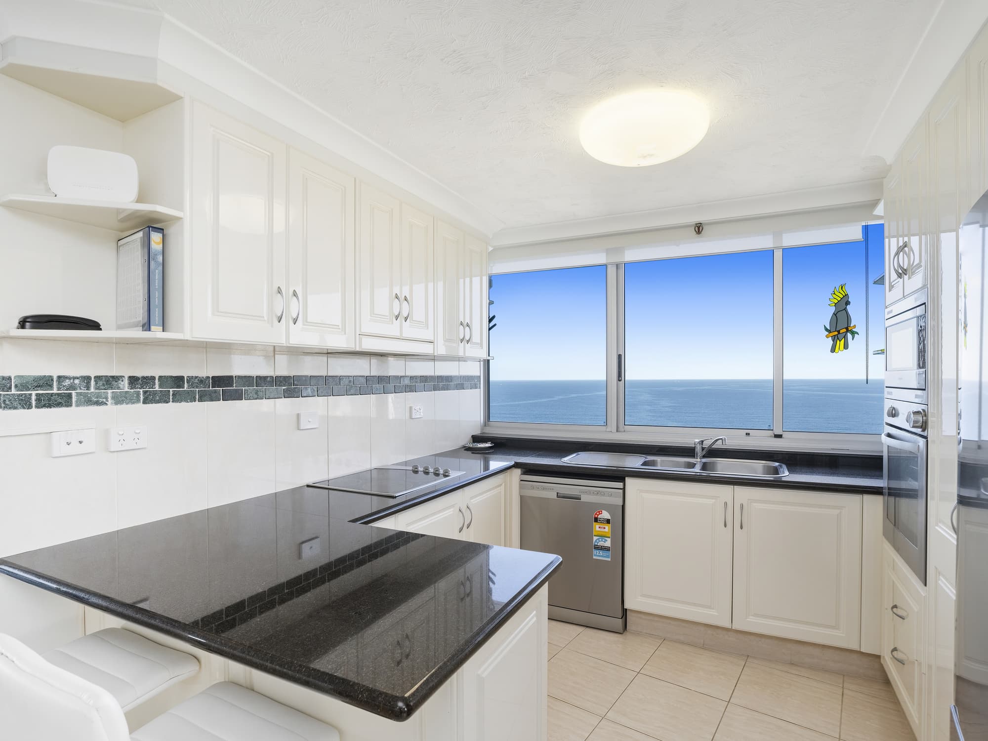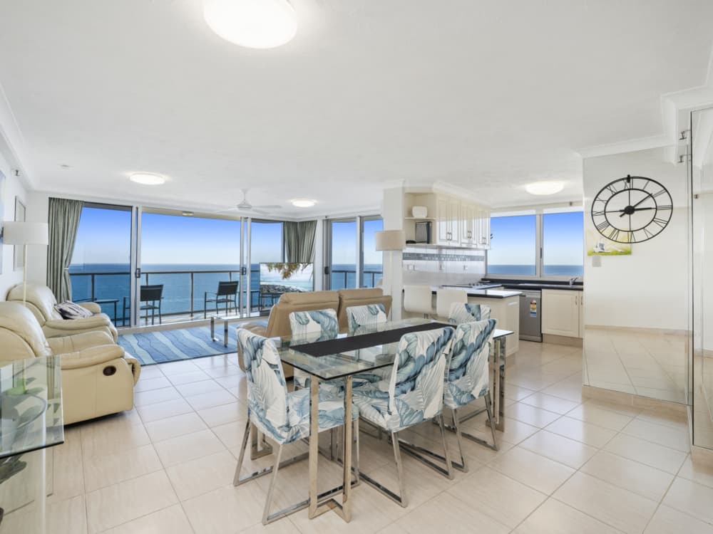 * Beautifully tiled throughout lounge/dining area which opens onto a direct oceanfront facing balcony.